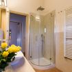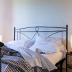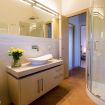 Alla sinistra dell’ingresso invece si accede all’altro spazio della casa dove gli ospiti troveranno: da un lato la terza camera, singola, arredata con letto, cassettone e comodino, un secondo bagno, anch’esso fornito di wc, lavabo, doccia, oltre che di lavatrice.