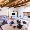 In questa ampia stanza gli ospiti troveranno due divani con tavolino di appoggio, il tavolo da pranzo in legno con le sedie ed una tv.