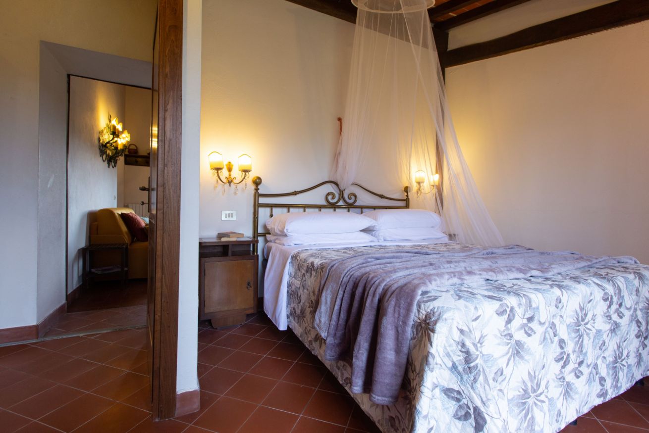 A destra del soggiorno si trova la prima camera da letto, con letto matrimoniale. La camera è connessa ad disimpegno con armadio, che conduce al bagno privato, completo di WC, lavabo e vasca da bagno.