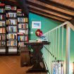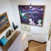 Sopra la cucina si trova invece un soppalco adibito a ufficio, perfetto per lo smart working, con scaffali, scrivania e sedia.