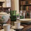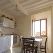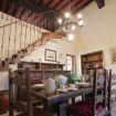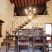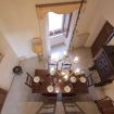 Nella sala da pranzo, alla quale si accede dal soggiorno, il tavolo in legno massello, i soffitti e le travi in legno ricordano un' atmosfera medievale.