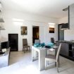 La cucina condivide gli spazi con una piccola area pranzo, con tavolo, sedie e Tv satellitare.